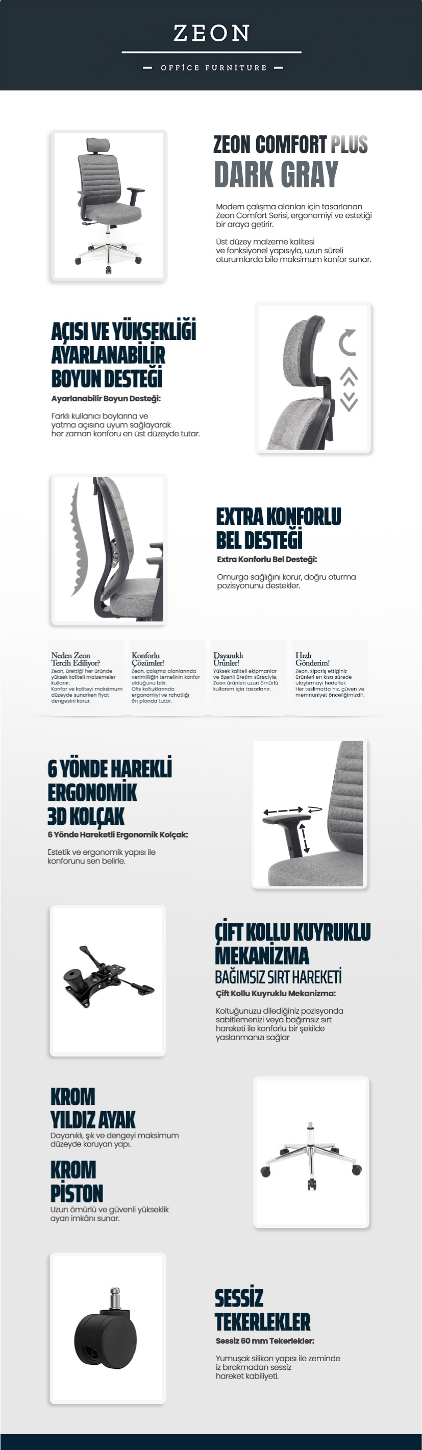 -Vücudu destekleyen ergonomik yapısı, uzun saatler boyunca dengeli ve rahat bir oturum sunarken; ayarlanabilir detayları kişisel konforunuzu en üst seviyeye taşır.