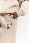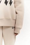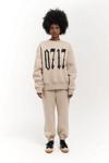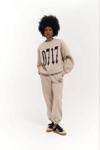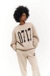 Hafif sweatshirt kumaştan, tezat renkte bisiklet yaka üst ve jogger pantolon set. Önü yazı baskılı, düşük omuzlu, yakası, manşetleri ve etek ucu ribanalı. Beli lastikli ve büzgü bağlı, paça ağızları lastikli jogger pantolon.