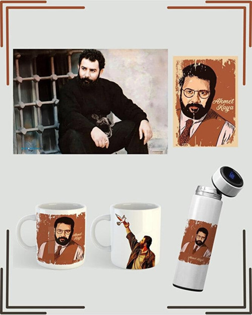 1 adet Ahmet Kaya termosu, 2 adet Ahmet Kaya kupası, 1 adet Ahmet Kaya posteri ve