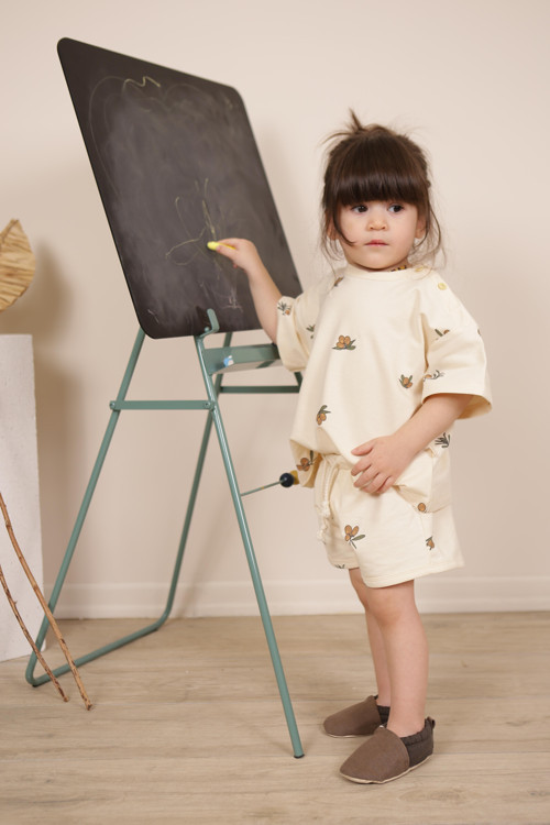 Bej rengiyle şıklığı ve rahatlığı bir arada sunan zeytin baskılı şortlu takım, günlük kullanım için idealdir.