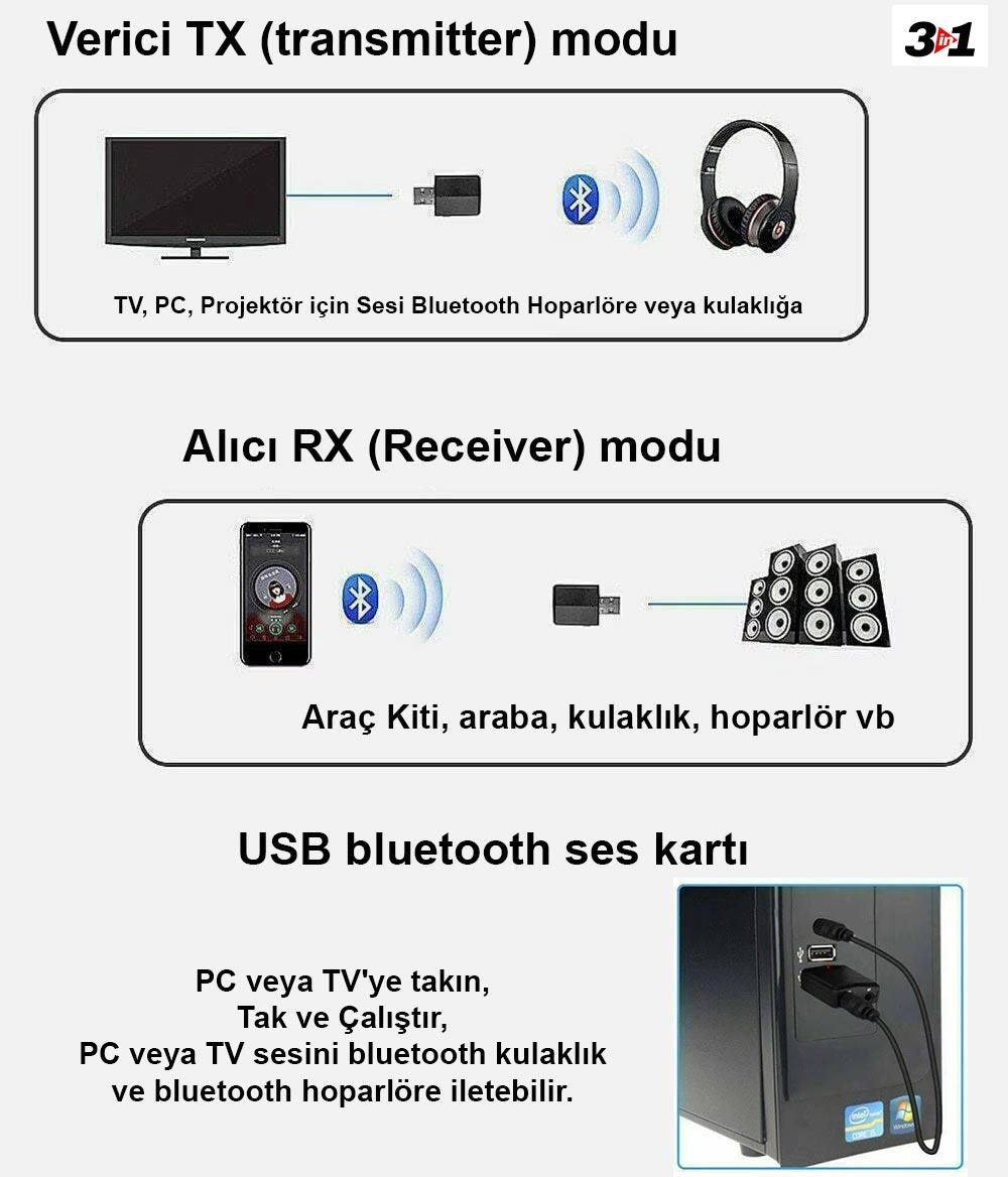 - 【3.5mm jack ses bluetooth verici (transmitter) modu】TV, PC, Projektör için Sesi Bluetooth Hoparlöre veya kulaklığa iletir.