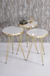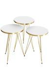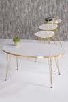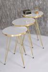 ORTA SEHPA:EN BOY:50*90 ORTA SEHPA YÜKSEKLİK:43 CM ; ZİGON SEHPA TÜM ÜST ÇAPLAR:34 CM ; ZİGON KÜÇÜK YÜKSEKLİK :47 CM ; ZİGON ORTA YÜKSEKLİK :51 CM ; ZİGON BÜYÜK YÜKSEKLİK:55 CM; Kenarları 1. sınıf ÖZEL ÜRETİM GOLD PVC bant ile kaplıdır.; Orta Sehpa ve 3.lü Zigon Sehpa Toplam 4 Parça Gönderim Sağlanmaktadır.. ; ?Kullanılan malzemeTSE, Avrupa Birliği EN, ISO 9001 ve FSC belgelerine sahiptir. ; Ayaklar 1.kalite Metaldir. ; Paketlerde kolay kurulum için gerekli tüm vida ve aksesuarlar bulunmaktadır. ; Ürünün montajı oldukça kolaydır.Basit el aletleri ile kolayca kurulum yapabilirsiniz. ; Hızlı ve hatasız kurulum için parça üzerinde kurulum şeması ile uyumlu parça bulunmaktadır.;