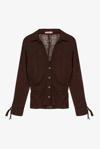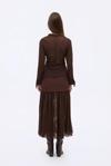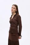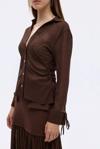Yanda büzgü detaylı lastikli, gömlek yaka, düğme kapamalı, bilekleri bağcıklı, transparan görünümde, kırışık dokulu kumaştan, uzun kollu gömlek.