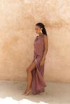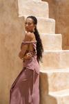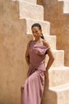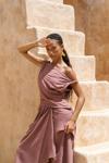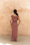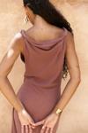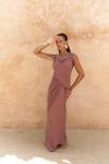 Kolsuz, düğüm detaylı kalın askılı, drapeli asimetrik kesim elbise. Bel kısmı katlı kesim, etek ucu geniş gelen dökümlü tasarım. Yan kısmı fermuar kapamalı. Astarsız.