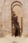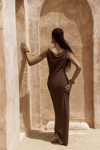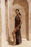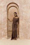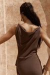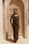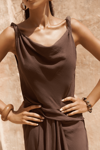 Kolsuz, düğüm detaylı kalın askılı, drapeli asimetrik kesim elbise. Bel kısmı katlı kesim, etek ucu geniş gelen dökümlü tasarım. Yan kısmı fermuar kapamalı. Astarsız.