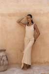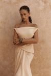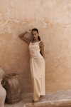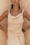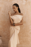 Kolsuz, düğüm detaylı kalın askılı, drapeli asimetrik kesim elbise. Bel kısmı katlı kesim, etek ucu geniş gelen dökümlü tasarım. Yan kısmı fermuar kapamalı. Astarsız.