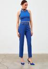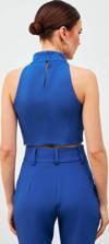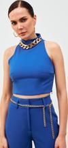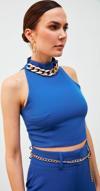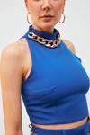 Dik yaka, arka yaka düğmeli, kolsuz, yandan fermuarlı, zincir aksesuarlı crop bluz.