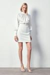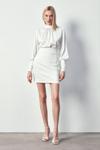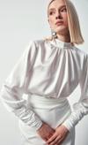 Dik yaka, düzgü ve fermuarlı balon kol, arka yaka düğmei kapama, zincir desenli saten bluz.