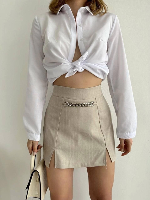 KAZAX marka zincir detaylı çizgili şort etek, şıklık ve rahatlık arayan kadınların tercihi.