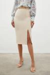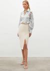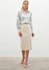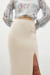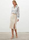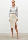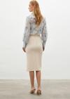 Yüksek bel, arka fermuarlı, yan yırtmaçlı, zincir detaylı kalem etek.