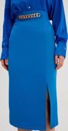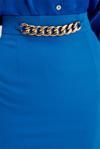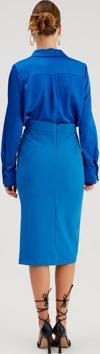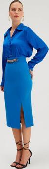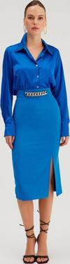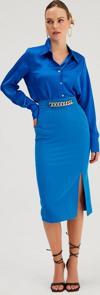 Yüksek bel, arka fermuarlı, yan yırtmaçlı, zincir detaylı kalem etek.