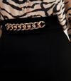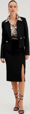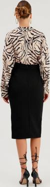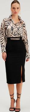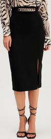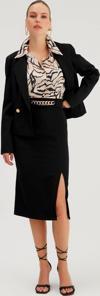 Yüksek bel, arka fermuarlı, yan yırtmaçlı, zincir detaylı kalem etek.
