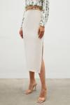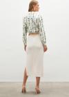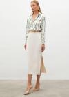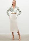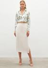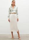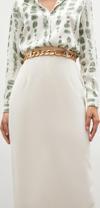 Yüksek bel, yan yırtmaçlı, arka fermuarlı, midi boy, zincir kemerli kalem etek.