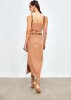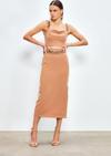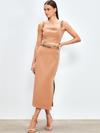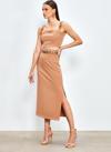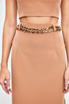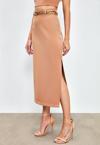 Yüksek bel, yan yırtmaçlı, arka fermuarlı, midi boy, zincir kemerli kalem etek.