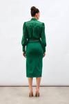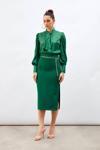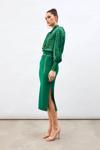 Yüksek bel, arka fermuarlı kapama, derin yırtmaçlı, zircir kemerli, midi kalem etek.