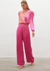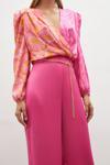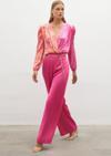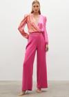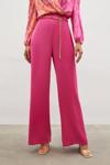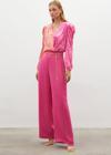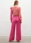 Yüksek bel, yan fermuarlı, geniş paça, zincir kemerli saten krep pantolon.