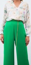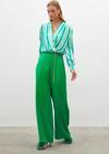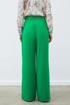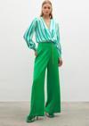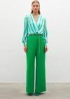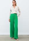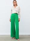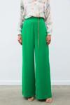 Yüksek bel, yan fermuarlı, geniş paça, zincir kemerli saten krep pantolon.
