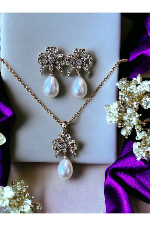 Bu zirkon taşlı fiyonk figür Mayorka inci kolye ve küpe seti, modern tasarımın klasik detaylarla buluştuğu bir aksesuardır. Fiyonk figürü ve zarif Mayorka incilerle süslenmiş bu set, özel günlerden günlük stilinize kadar her ortamda şıklığınızı tamamlar.