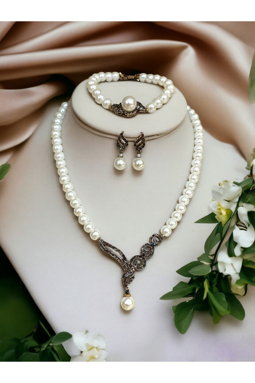 - Göz alıcı zirkon taşlarla süslenmiş, her türlü özel gününüzde şıklığınızı tamamlayacak tek sıra inci kolye.; - Üç parçadan oluşan set; zarif inci küpelerle tamamlanarak, kıyafetlerinize sofistike bir dokunuş katıyor.; - Bronz materyal kullanımı sayesinde hem dayanıklı hem de uzun ömürlü bir kullanım sunuyor.; - Türk menşeli bu set, yerel üretim gururunu yansıtarak kalite standartlarına uygun üretilmiştir.
