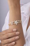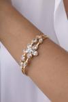 Merkezde yonca şeklinde dizilmiş parlak taşlar, ışığı her açıdan yansıtarak bileziğe eşsiz bir ışıltı kazandırır. Günlük hayatta sade şıklığınızı desteklerken, özel davetlerde ve kutlamalarda da göz alıcı bir aksesuar olarak kombinlerinizi tamamlar.