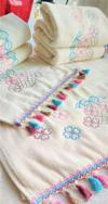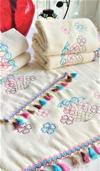 Ürün içerisinde 3 adet El havlusu 50X90 cm. , 3 adet 30x50 Mutfak Havlusu olarak 2 ebatta 3+3=toplam 6 adet KANAVİÇE çiçek desenli püsküllü havlu bulunmaktadır.