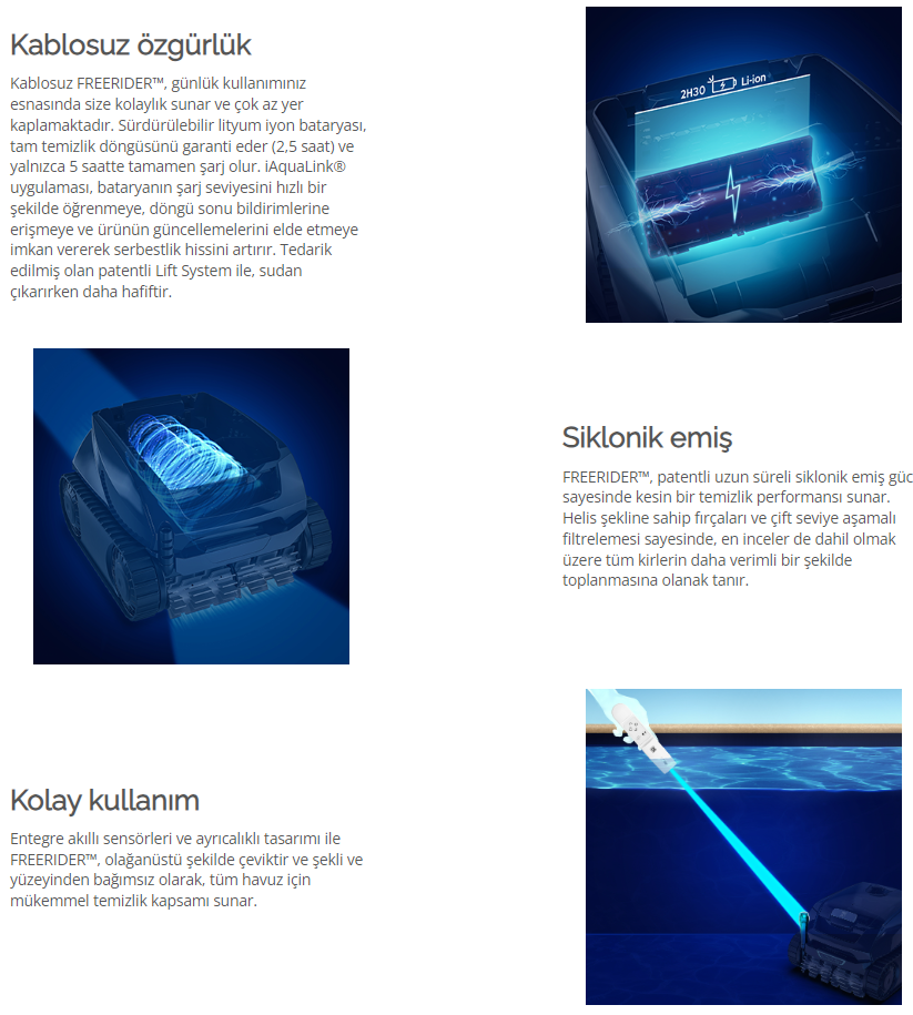 Kullanımı kolayEntegre akıllı sensörleri ve benzersiz tasarımıyla FREEDOM son derece çeviktir ve şekli veya yüzeyi ne olursa olsun havuzunuz için mükemmel temizlik kapsamı sunar.