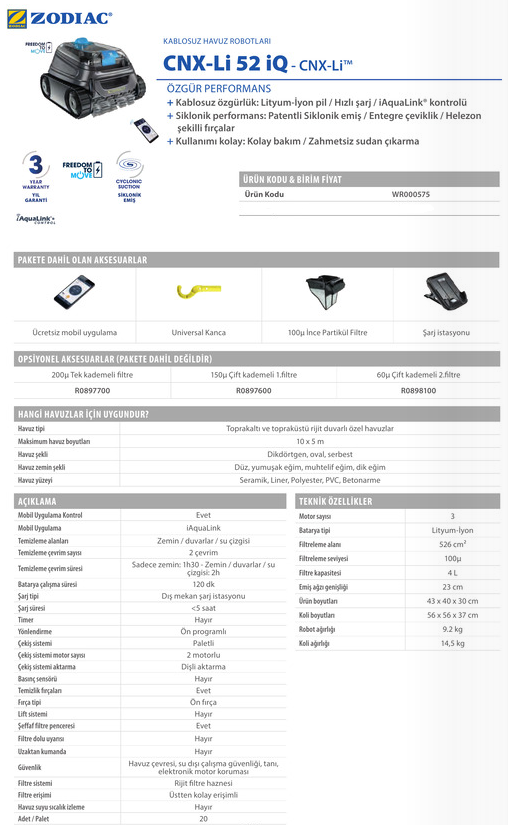 Zodiac Şarjlı Cnx Li-52-İQ Kablosuz Şarjlı Havuz Robotu Stok Kodu: WR000575