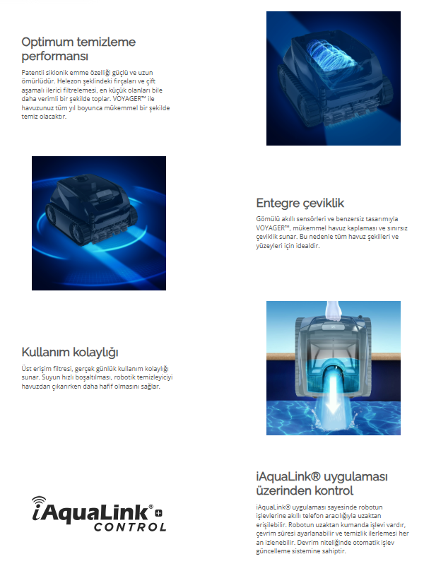 Re 4400 Voyager Havuz Robotu Zodiac Voyager Elektrikli Otomatik Havuz süpürme robotu Optimum temizleme performansı: patentli siklonik emiş helix şekilli fırçalar büyük emiş kapasitesi entegre çevik tüm havuz şekillerine ve yüzeylerinde çalışmak üzere tasarlanmış paleti ivme ölçer ve jiroskop sen sörleri sayesinde kolay kullanımı ve filtreye üsten kolaylıkla ulaşımı ve şeffaf filtre penceresi sayesinde filtrenin doluluk oranını gözünüzle fark ede bilinmesi re voyager 4400 havuz robotunun kullanımının ne kadar kolay olduğunu gösteriyor. VOYAGER re 4400 havuz temizleme robotu ile havuzunuz tüm yıl boyunca mükemmel şekilde temiz olacaktır. Entegre çeviklik sensörleri ve benzersiz tasarımı ile VOYAGER re4400 mükemmel havuz temizliği ve sınırsız çeviklik sunar. Böylelikle her türlü havuz için şekli ve yüzeyi nasıl olursa olsun idealdir. patentli siklonik emiş süreci o kadar emmek ve diğer enkaz süpürmeyiniz devam ederken süspansiyon kir parçacıklarını tutar. Sürekli ve güçlü temizlik sağlayan 23 cm emiş ağzına sahiptir. Havuz tabanı için temizleme döngüsü. 1 saat 30 dakika süre. Taban, duvarlar ve su hattı için temizleme döngüsü. 2 saat 30 dakika süre. Referans: WR000331 Motorlar (no.): 3 Besleme gerilimi - Kontrol sistemi: 200-240 VAC Güç kaynağı voltajı - Temizleyici: 30 VDC Kablo uzunluğu: 15 m Havuz boyutu 10x5m Boyutlar: 43 x 40 x 30 cm Ağırlık: 8 kg Filtrasyon sistemi: Üstün çelikten inçe partikül filtre 1 adet Filtre kapasitesi: 4 L Filtrasyon inceliği: 100 mikron. Emme ağzı genişliği: 23 cm. Garanti: 2 yıl.