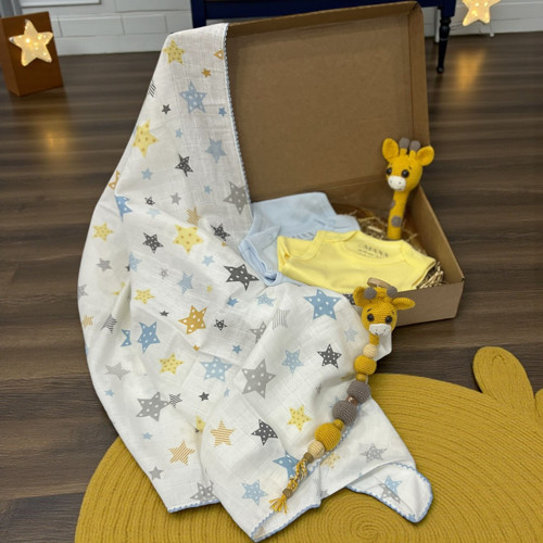 YILDIZ BASKILI TEK TARAFLI MÜSLİN BATTANİYE 90X90 CM, KOLSUZ PENYE ÇITÇITLI BODYSARI VE MAVİ,AMİGURUMİ AYICIK OYUNCAK,AMİGURUMİ ZÜRAFA ÇINGIRAK VE AMİGURUMİ ZÜRAFA DETAYLI EMZİK ASKISI DAHİL BEŞ PARÇADAN OLUŞAN BİR SETTİR. BODY BEDENİ 0-3 AYDIR. İSİM YAZDIRILABİLİR. ÖZEL KUTUSUNDA GÖNDERİM YAPILACAKTIR. SEVDİKLERİNİZİ MUTLU EDECEK HARİKA BİR HEDİYEDİR.