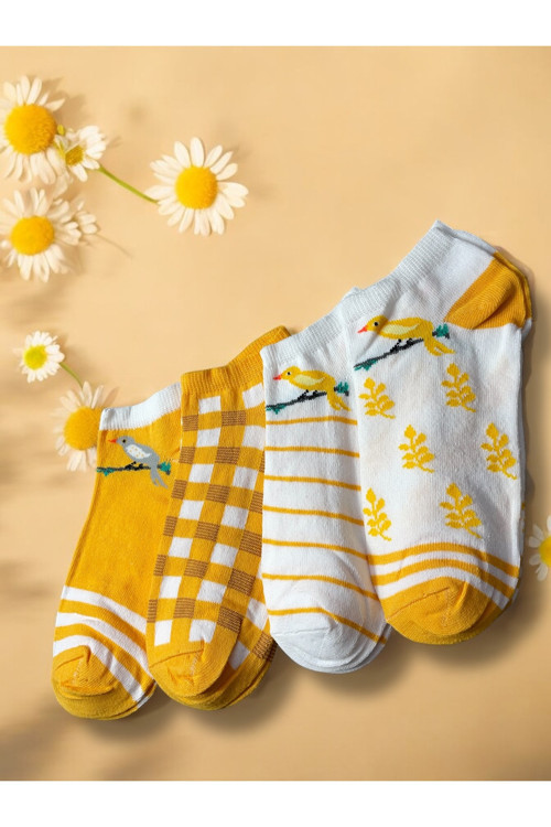 Genç ve dinamik tarzınızı yansıtan, 4'lü kuş çiçek desenli sarı beyaz görünümlü patik çoraplarla stilinizi tamamlayın.